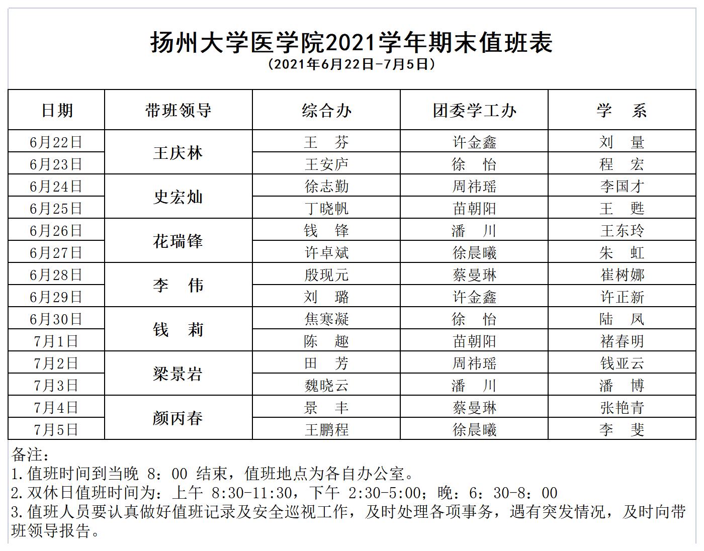 扬州大学医学院2021学年期末值班表