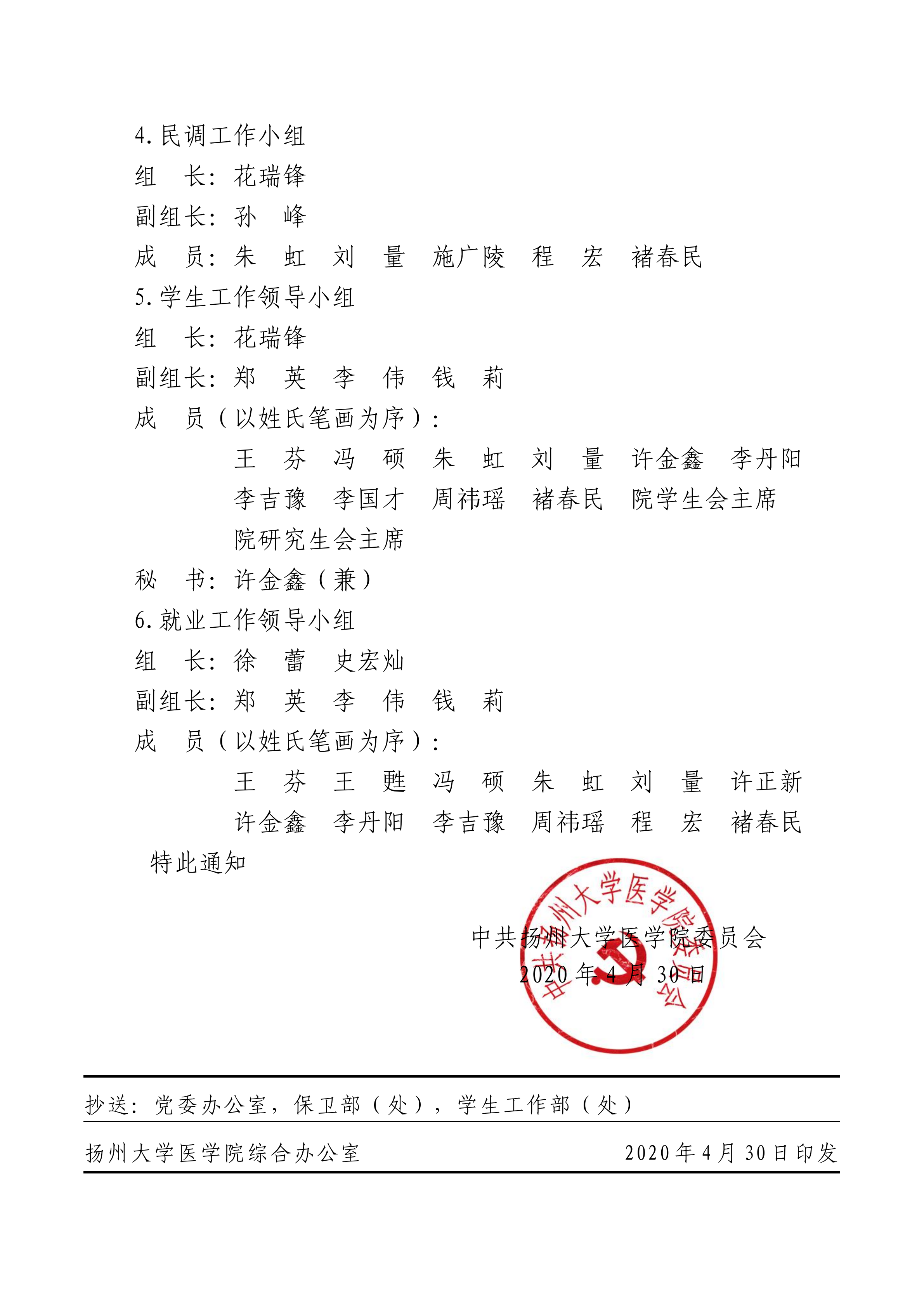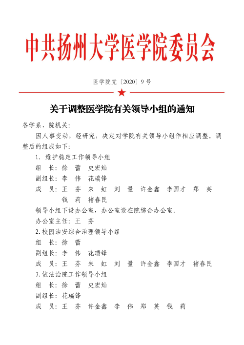 关于调整医学院有关领导小组的通知(医学院党〔2020〕9号)