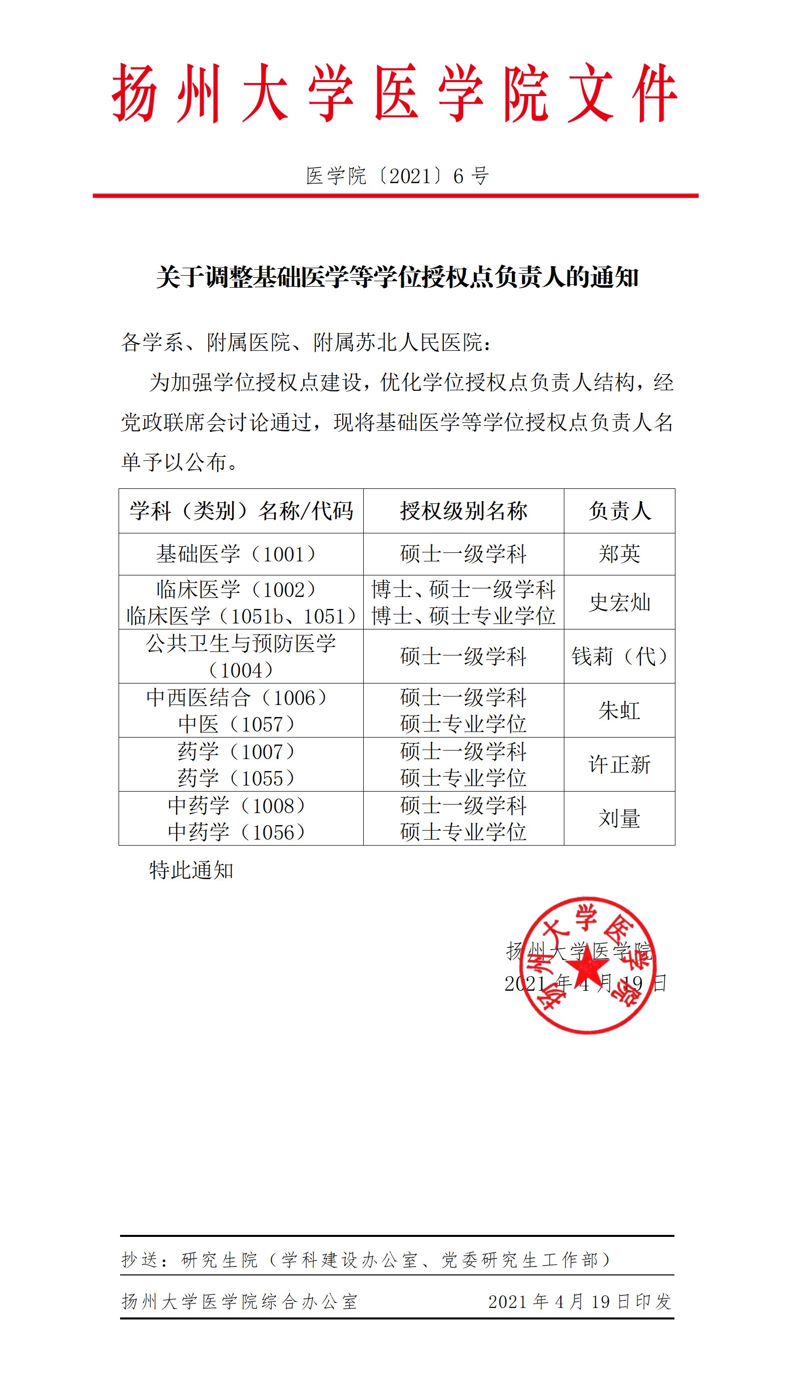 关于调整基础医学等学位授权点负责人的通知(医学院〔2021〕6号)