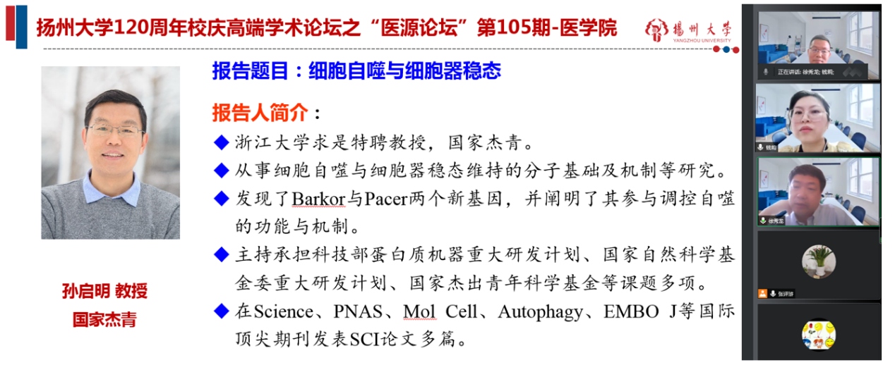 5月17日下午,浙江大学求是教授、国家杰青、我校杰出校友孙启明教授应邀走进“建校120周年高端学术论坛”、医学院第105期“医源论坛”,为我校师生做了题为“细胞自噬与细胞器稳态”的专题报告,钱莉副院长主持报告会。