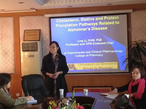 11月4日上午10时,美国明尼苏达大学药学院李玲教授来我院做了题为 “Cholesterol, Statins, and Protein Prenylation Pathways Related to Alzheimer’s Disease”的专题学术报告,并跟与会师生亲切交流。