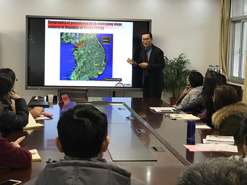 2月20日下午,韩国江原大学教授,博士生导师,Eun-Taek Han给我院师生做了“Recent progress of discovery of novel erythrocyte binding proteins for Plasmodium vivax”的专题学术报告。韩教授结合自己的工作实践,从研究领域的选择、韩国疟疾流行情况、疟原虫入侵红细胞的研究进展等方面进行了介绍,并就靶标的筛选、蛋白表达、研究生招生标准等方面与在座师生进行了亲切交流与讨论。