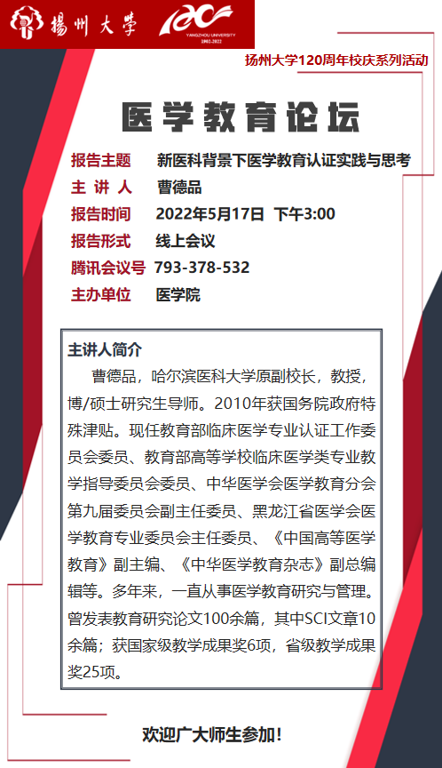 曹德品,哈尔滨医科大学原副校长,教授,博/硕士研究生导师。2010年获国务院政府特殊津贴。现任教育部临床医学专业认证工作委员会委员、教育部高等学校临床医学类专业教学指导委员会委员、中华医学会医学教育分会第九届委员会副主任委员、黑龙江省医学会医学教育专业委员会主任委员、《中国高等医学教育》副主编、《中华医学教育杂志》副总编辑等。多年来,一直从事医学教育研究与管理。曾发表教育研究论文100余篇,其中SCI文章10余篇;获国家级教学成果奖6项,省级教学成果奖25项。