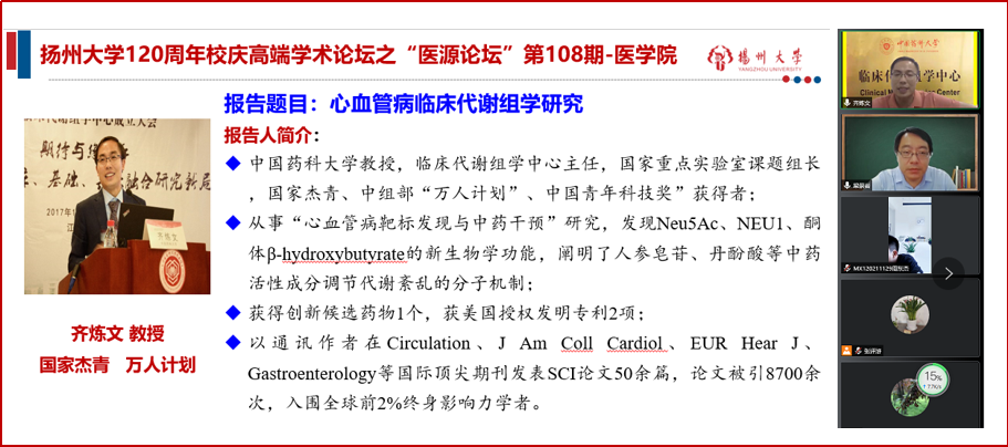 6月22日下午,国家杰青、中国青年科技奖获得者、中国药科大学临床代谢组学中心主任齐炼文教授应邀走进“扬州大学建校120周年高端学术论坛”医学院第108期“医源论坛”,为我校师生作题为“心血管病临床代谢组学研究”的专题报告,梁景岩副院长主持报告会。