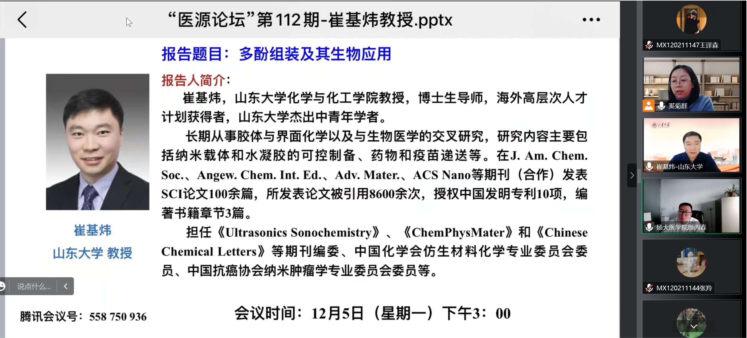 12月5日下午,山东大学教授、海外高层次人才计划获得者、山东大学杰出中青年学者崔基炜教授应邀走进我院第112期“医源论坛”,为我院师生作题为“多酚组装及其生物医学应用”的专题报告。本次论坛由奚菊群教授主持,采用线上方式进行,近100余位师生参会。