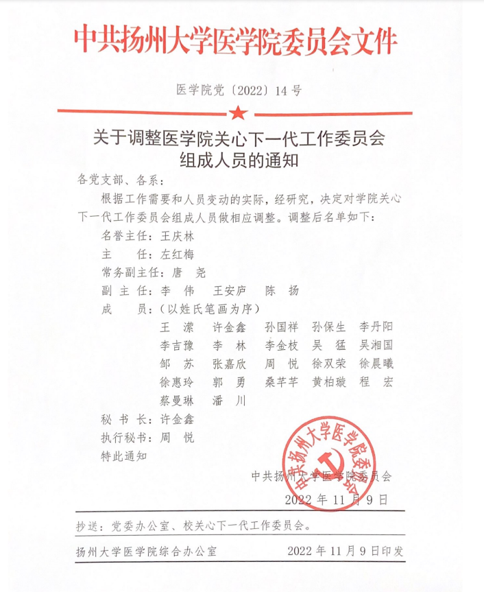 关于调整医学院关心下一代工作委员会组成人员的通知(医学院党〔2022〕14号)
