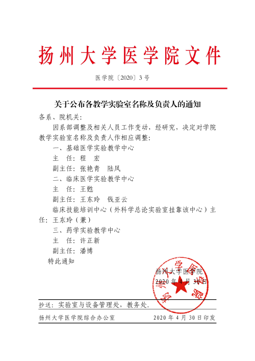 关于公布各教学实验室名称及负责人的通知(医学院[2020]3号)