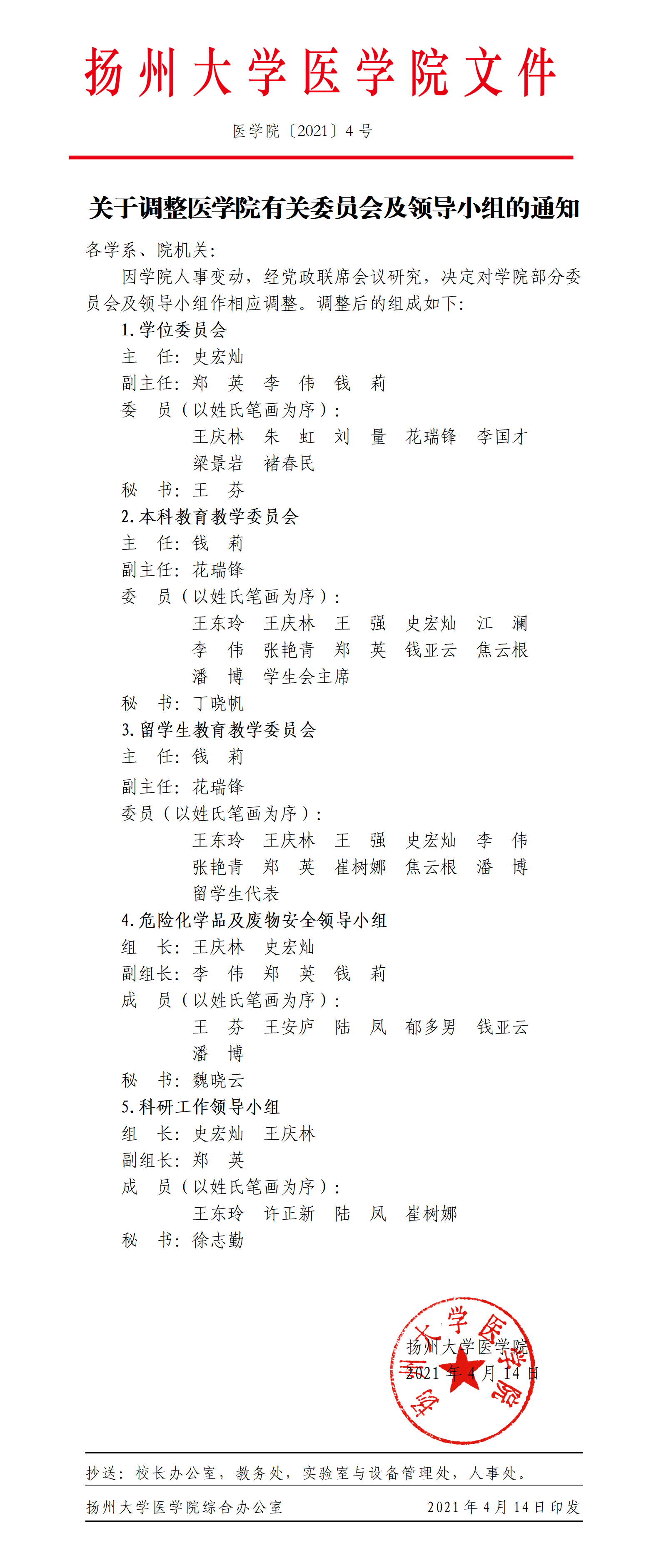 关于调整医学院有关委员会及领导小组的通知(医学院〔2021〕4号)