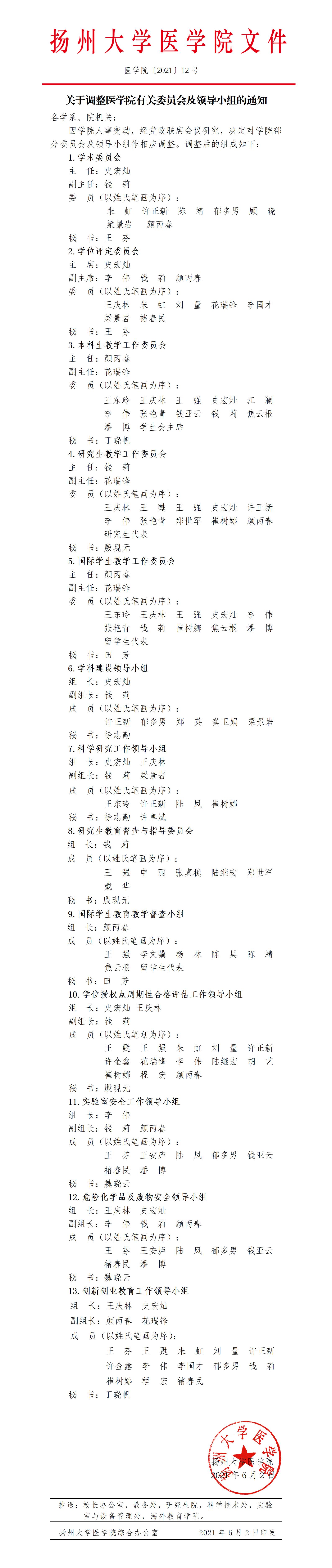 关于调整医学院有关委员会及领导小组的通知(医学院〔2021〕12号)